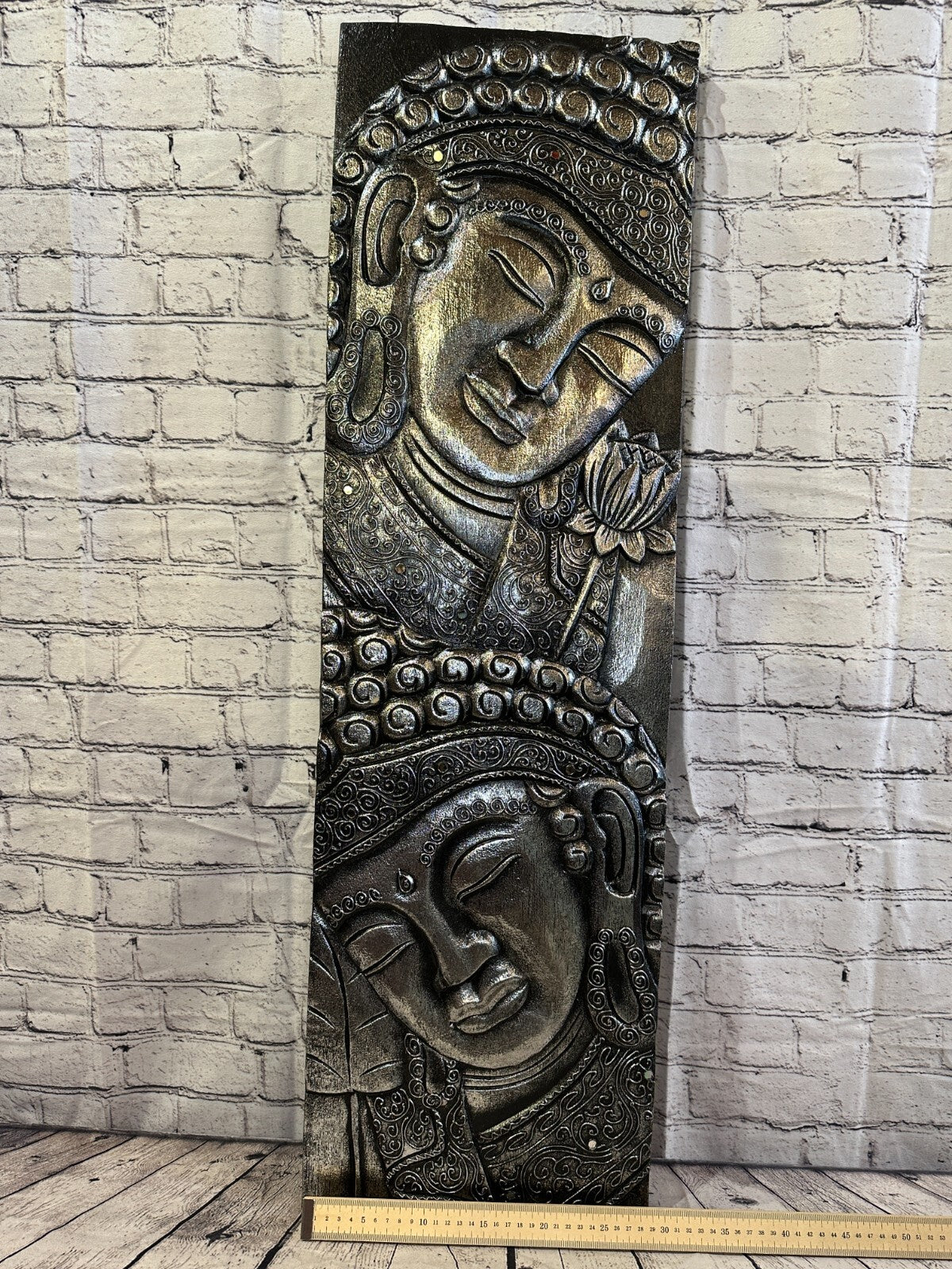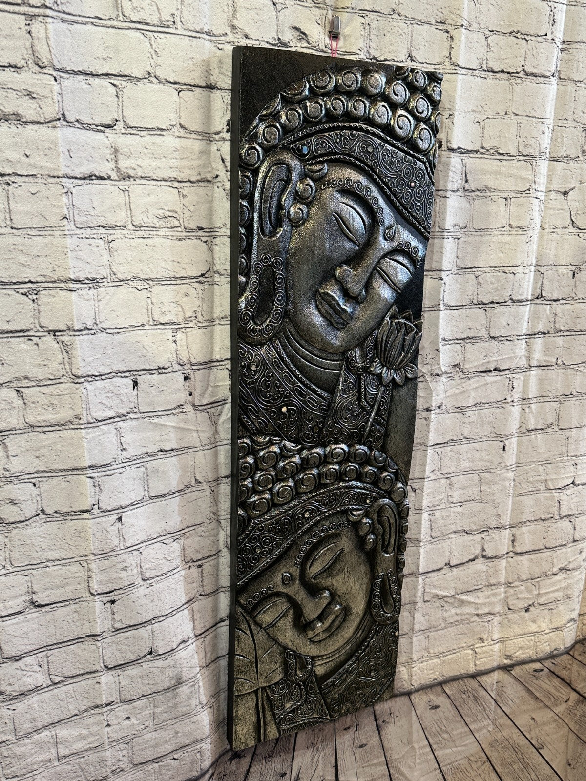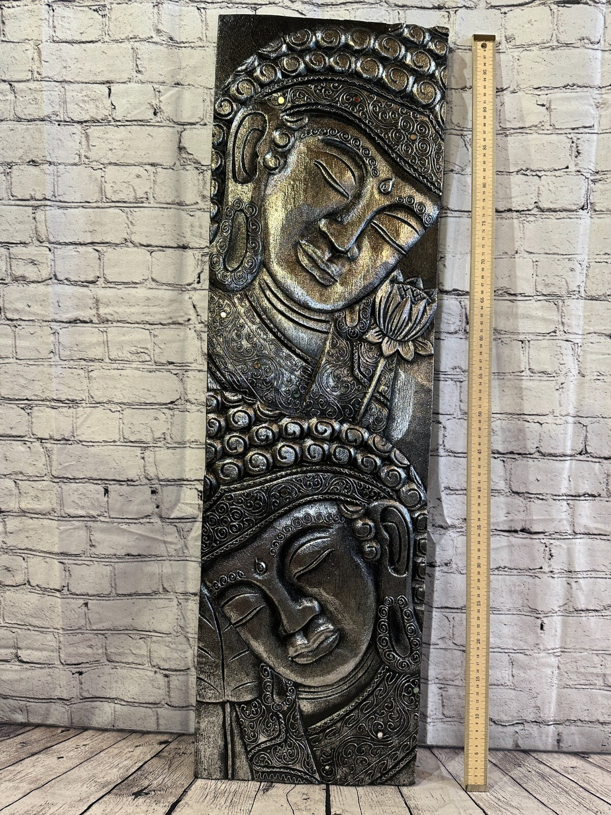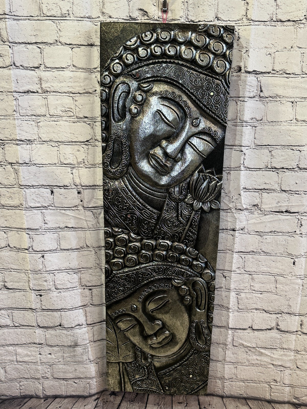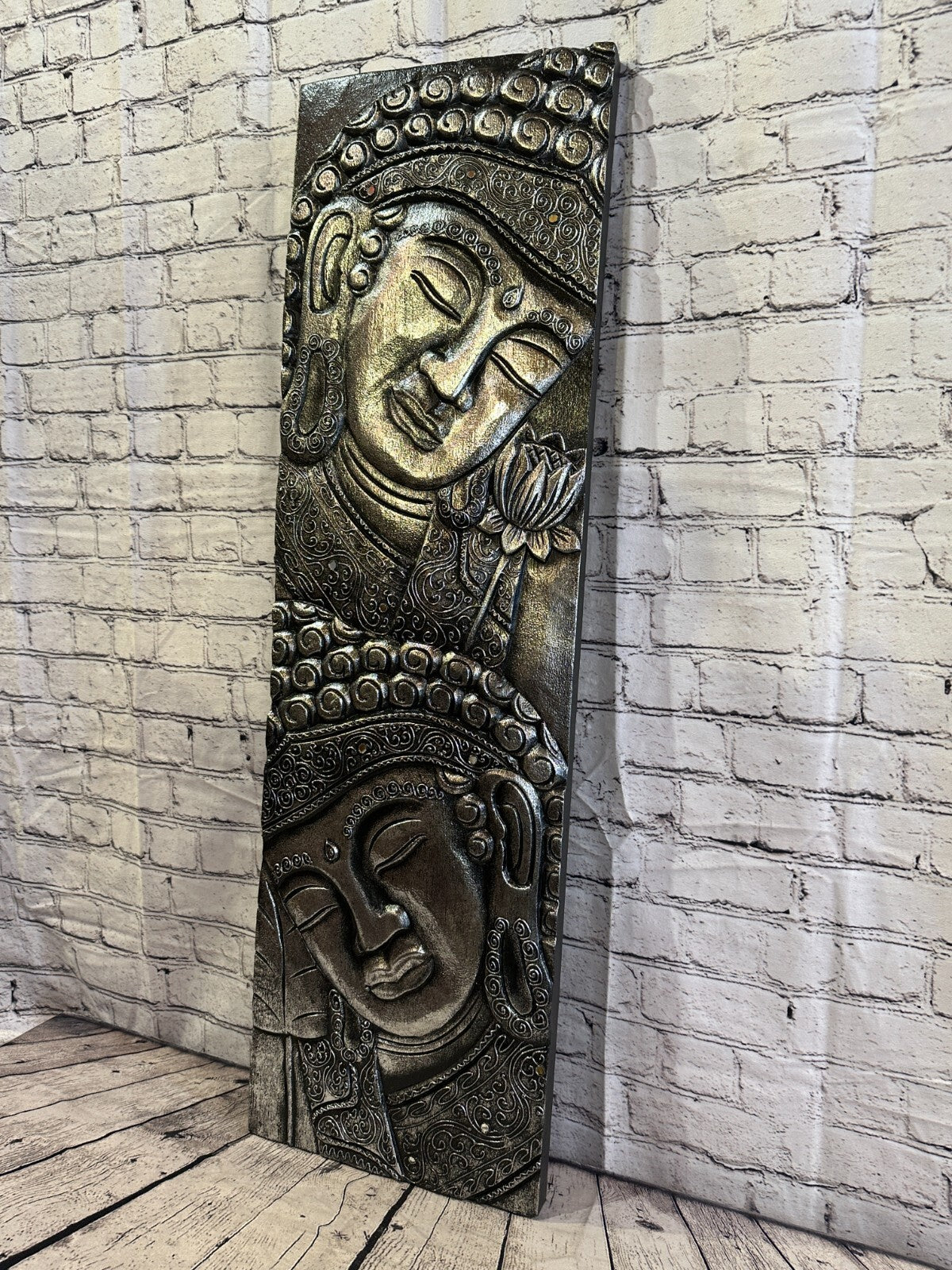 100cm x 30cm Tall Buddha 2 Faces Silver Wooden Wood Panel Wall Art Plaque