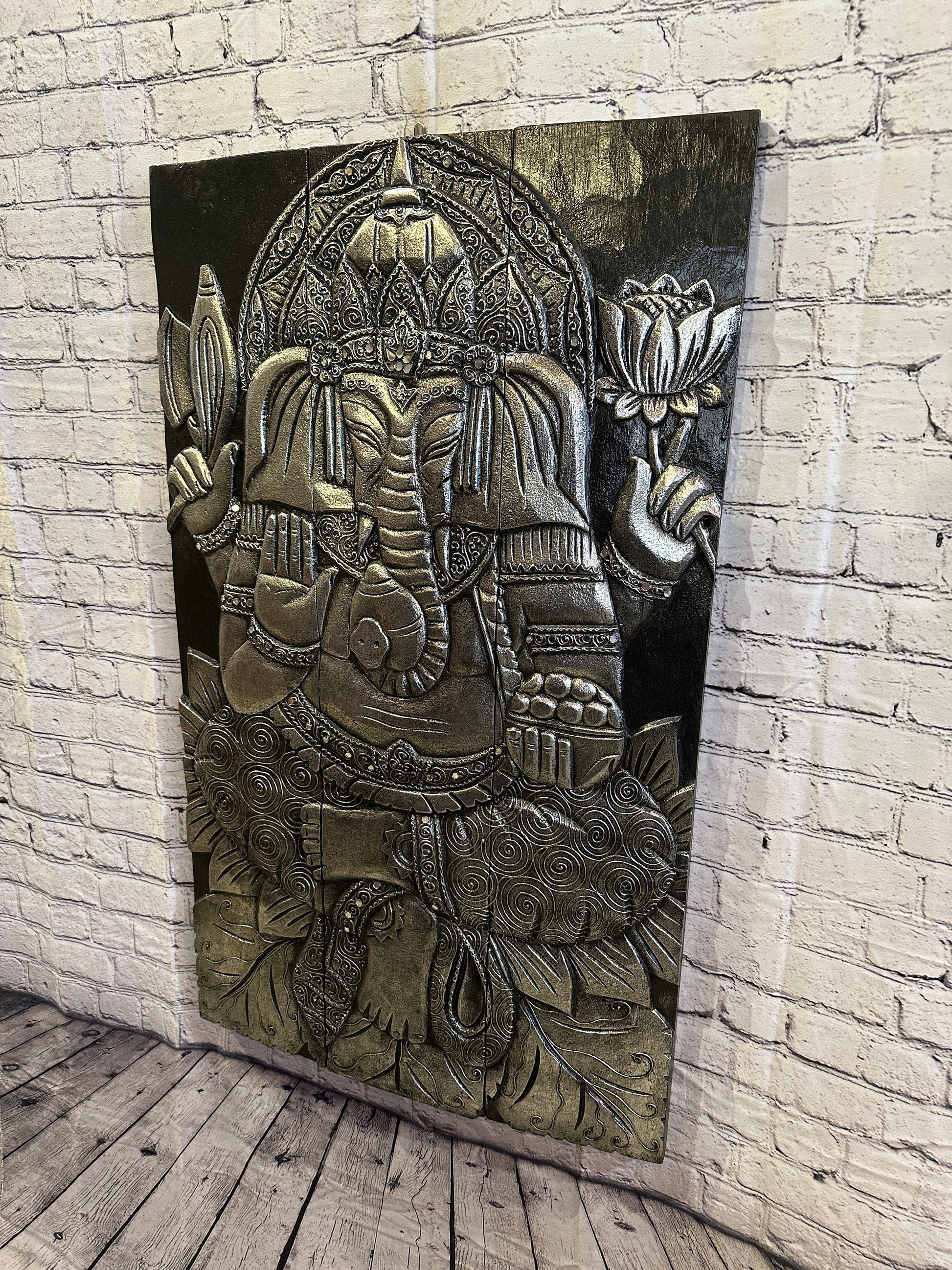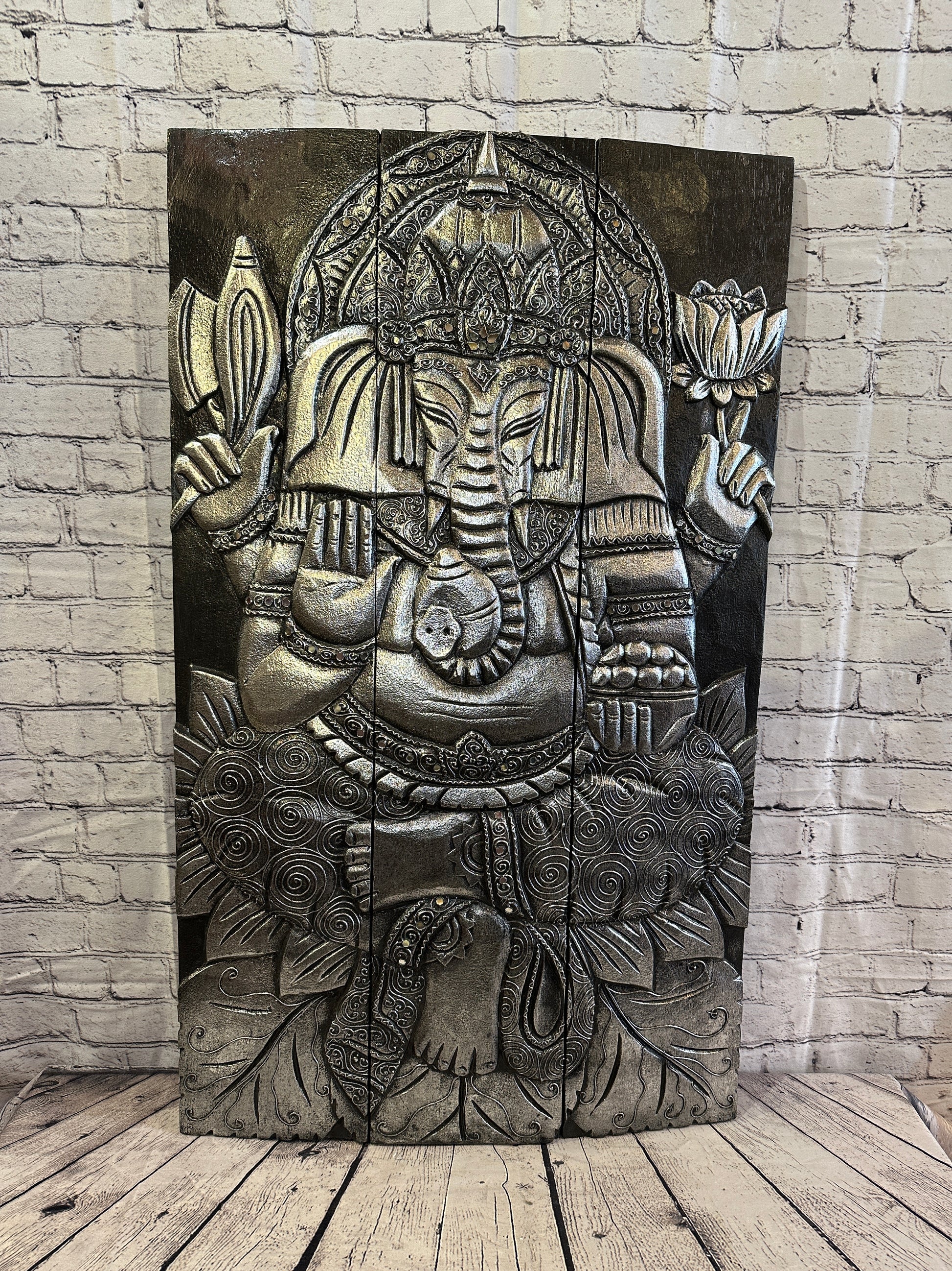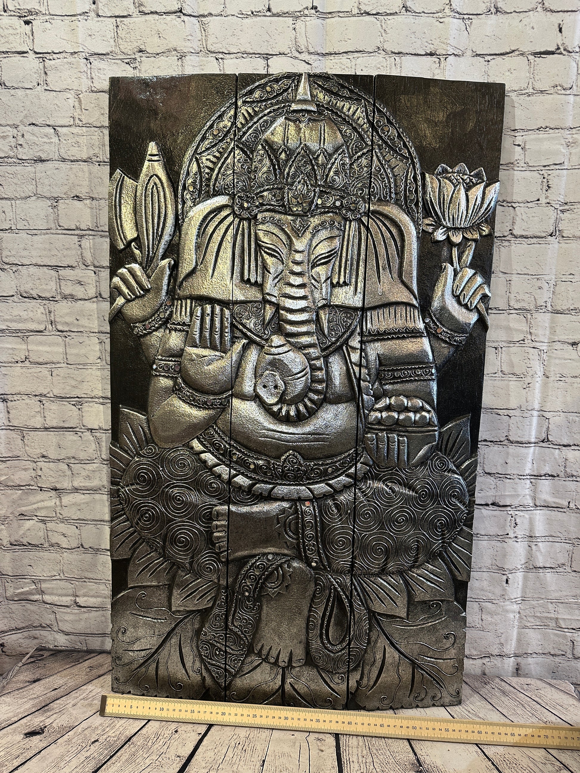 100cm x 60cm Ganesh Silver Panel Wooden Wood Panel Wall Art Plaque Handcarved
