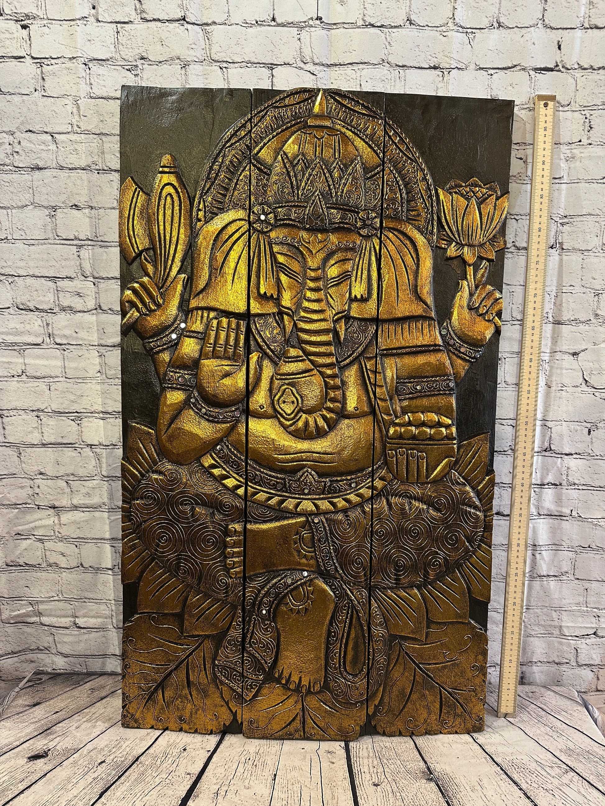 100cm x 60cm Ganesha Brown Gold Wooden Wood Panel Wall Art Plaque Handcarved