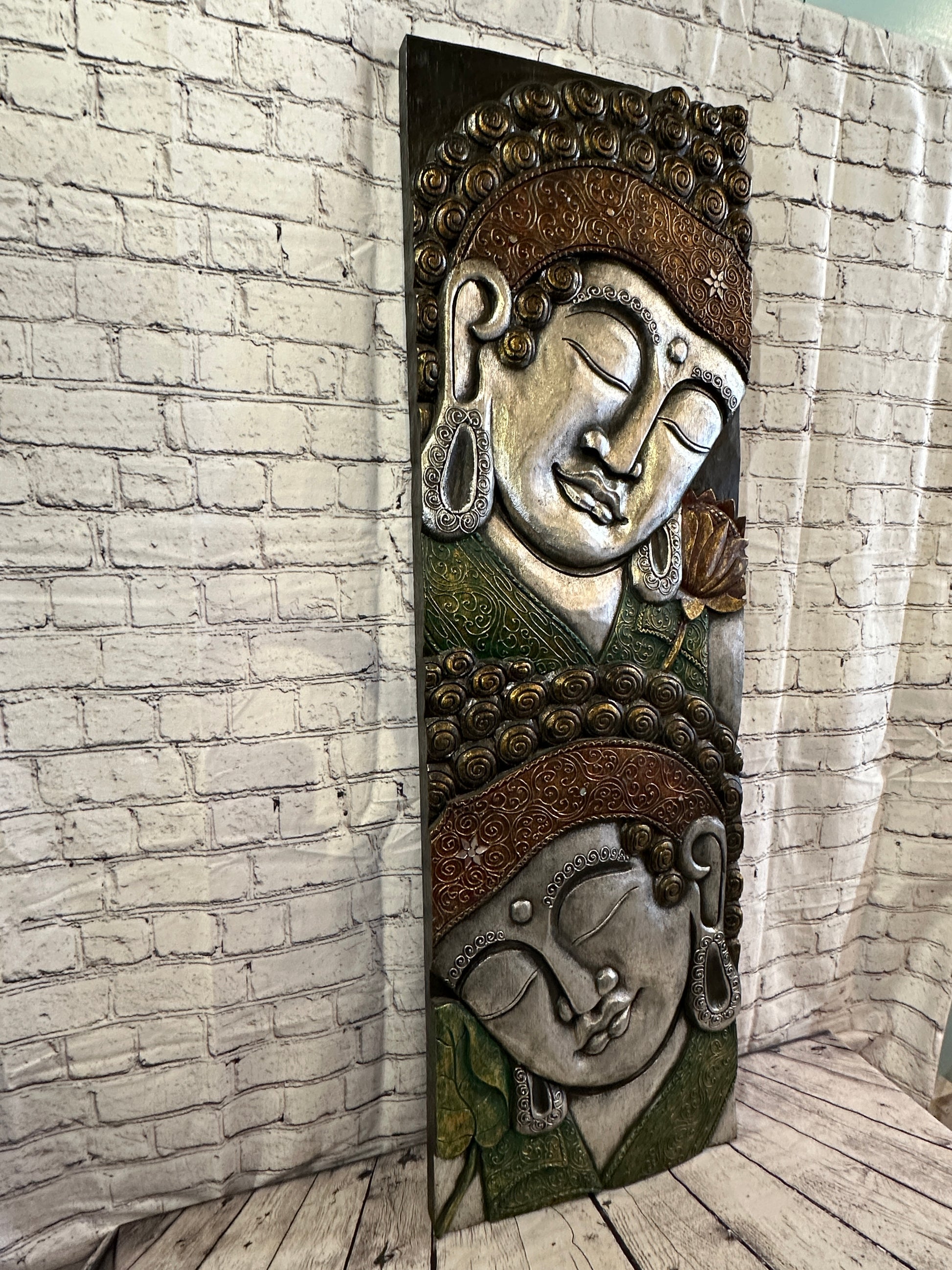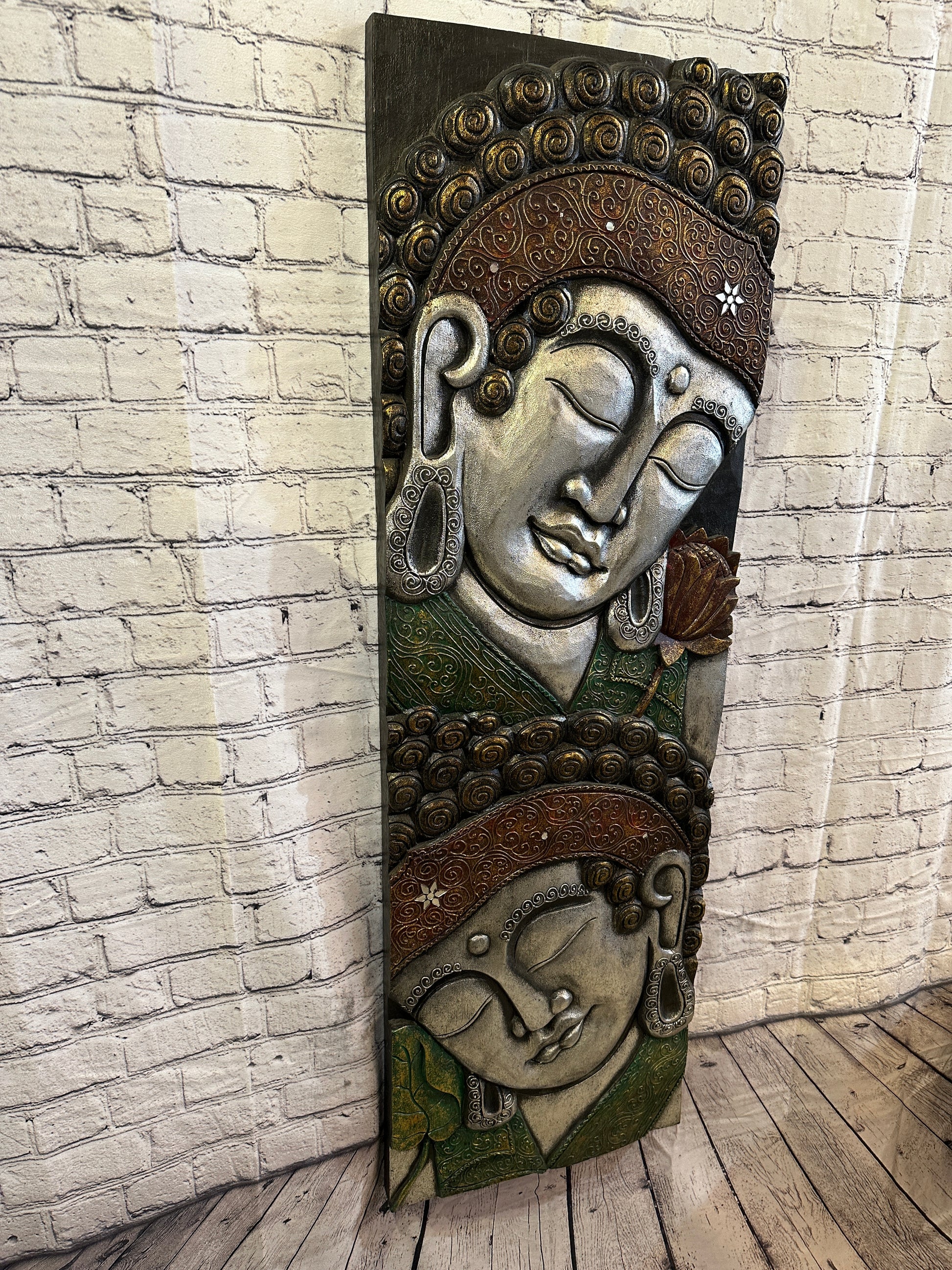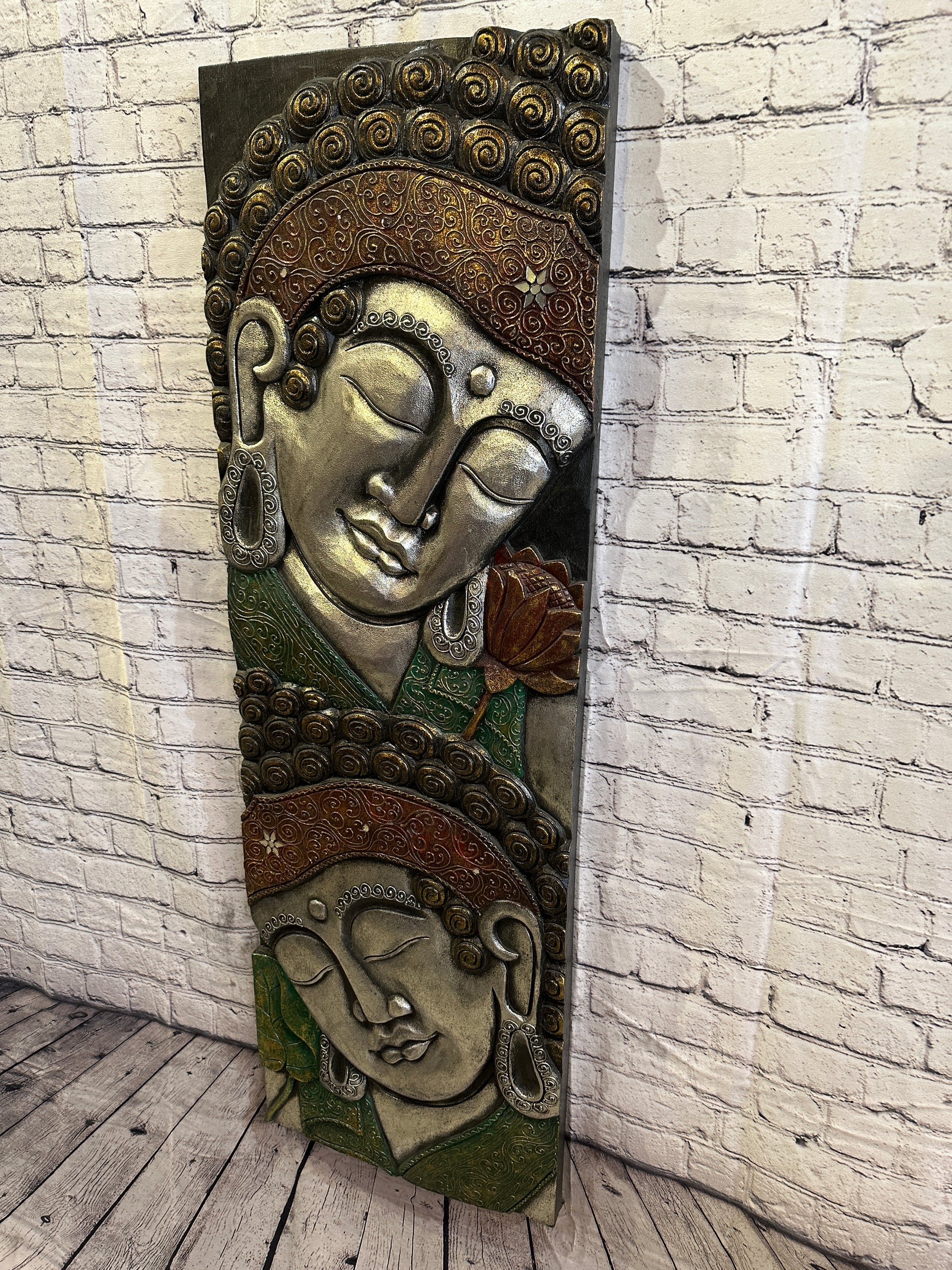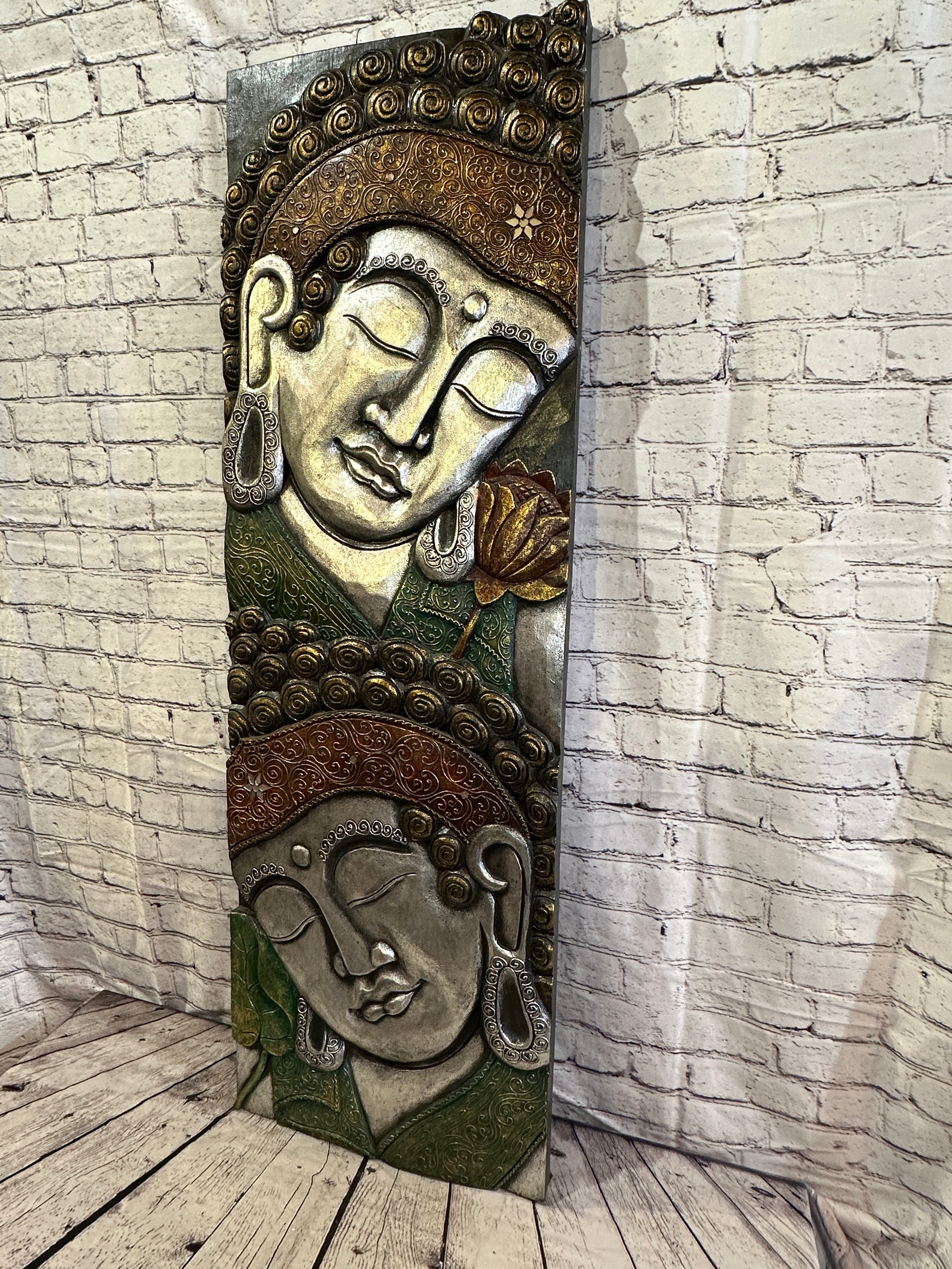 120cm x 40cm Tall Buddha 2 Faces Multi Colour Wooden Wood Panel Wall Art Plaque