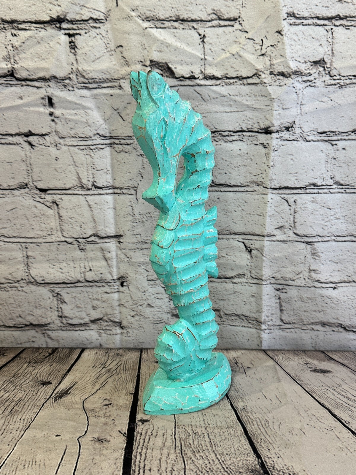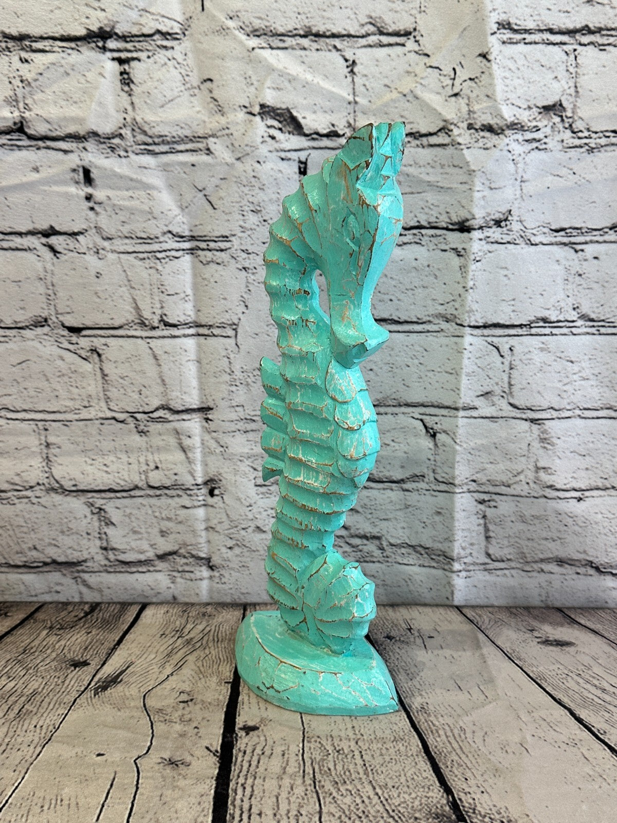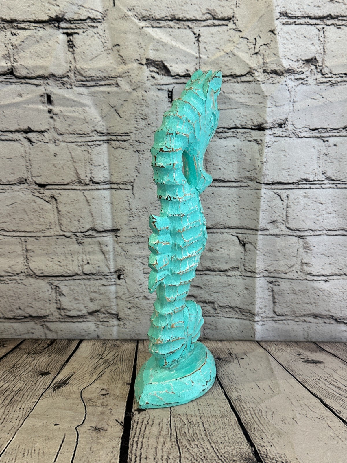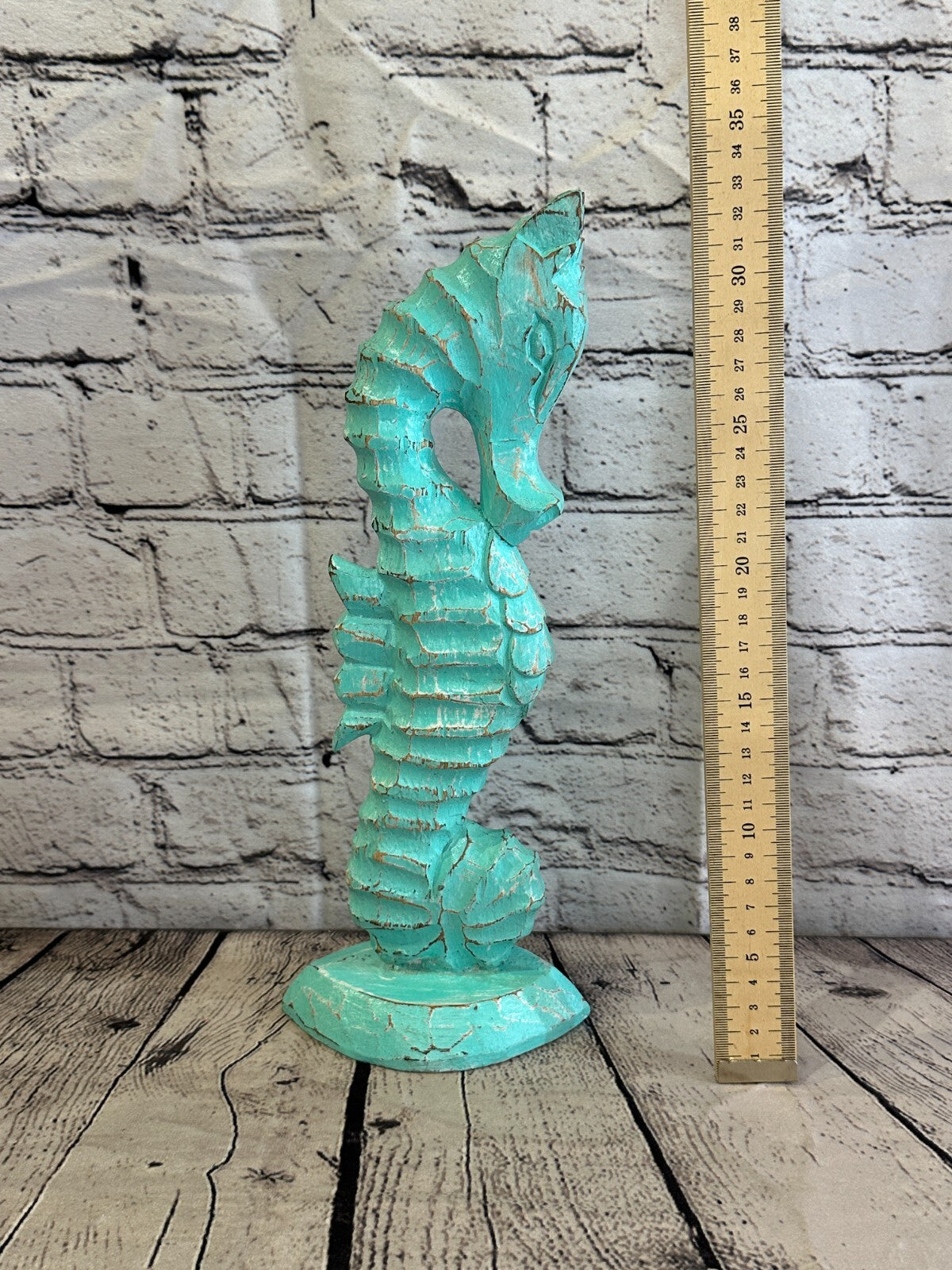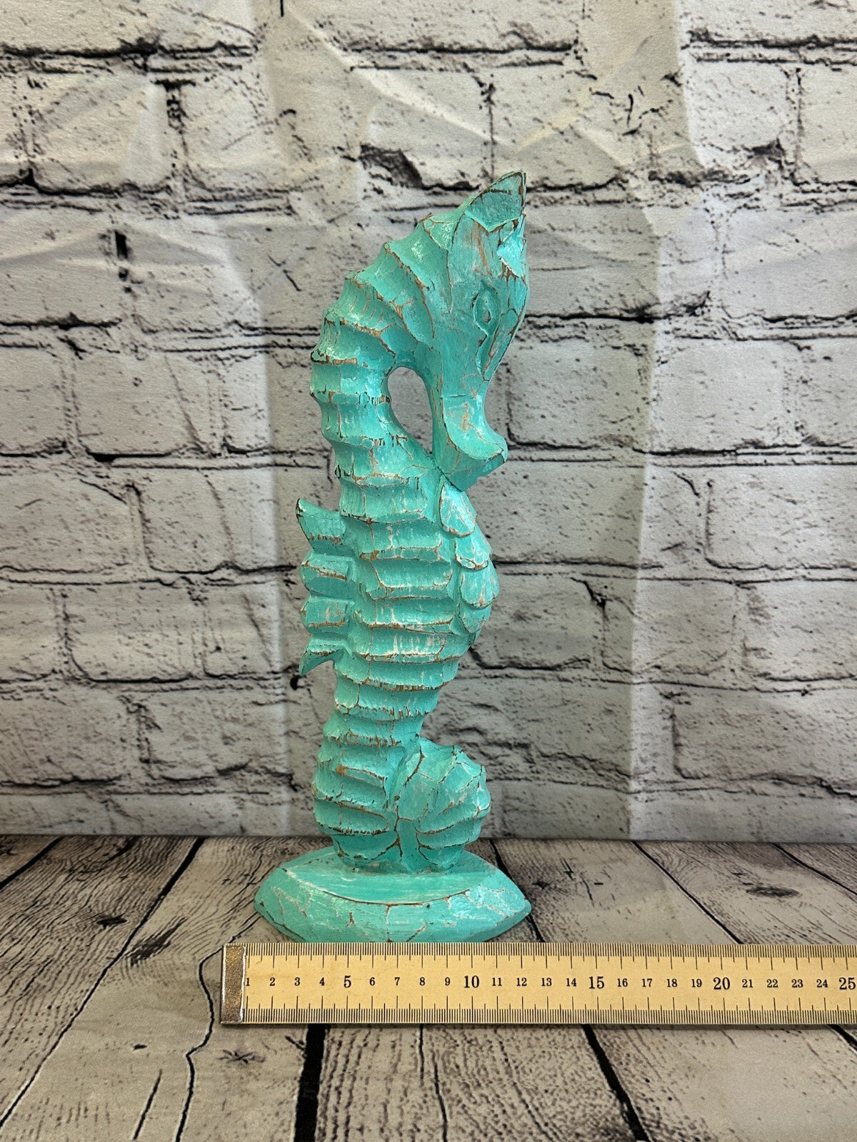 30cm Green Plain Wooden Shabby Seahorse Statue Ornament Fair Trade Handcarved