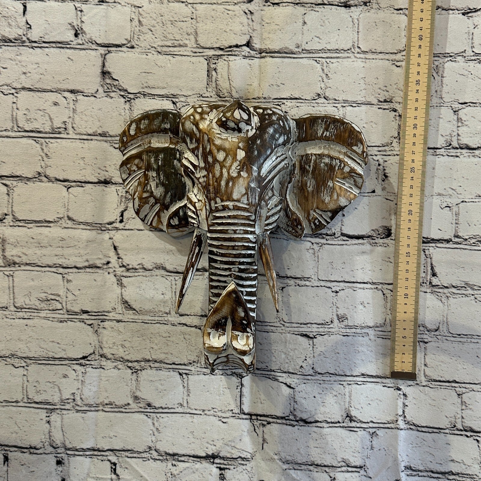 30cm x 30cm Brown Carved Wood Elephant Head Wall Mounted Art Large Shabby