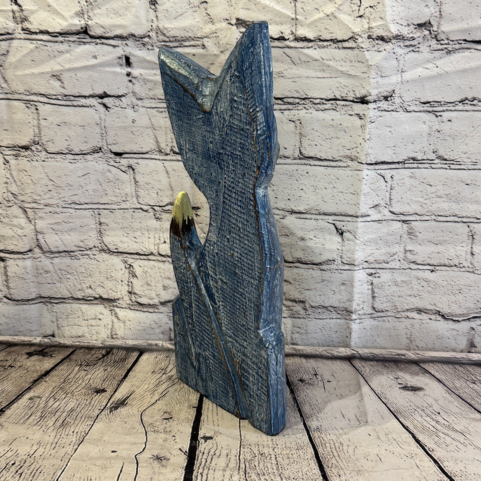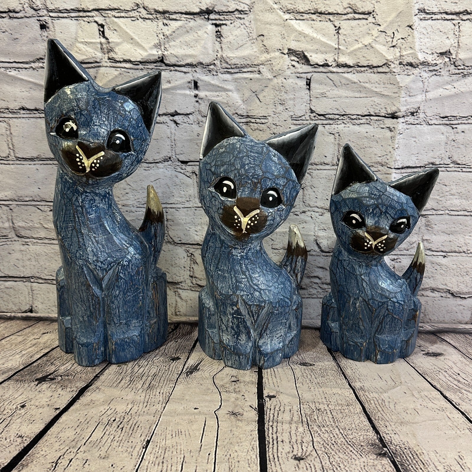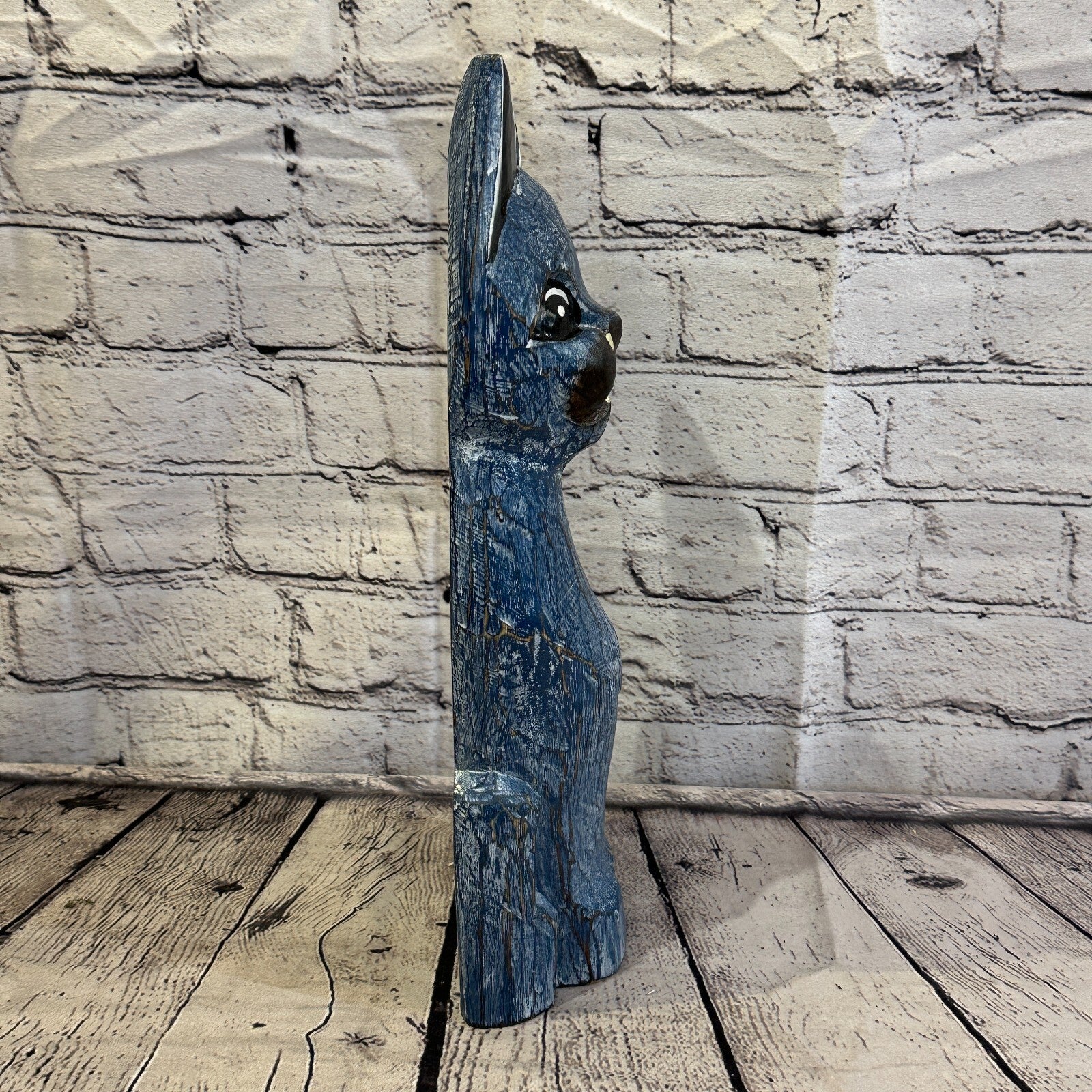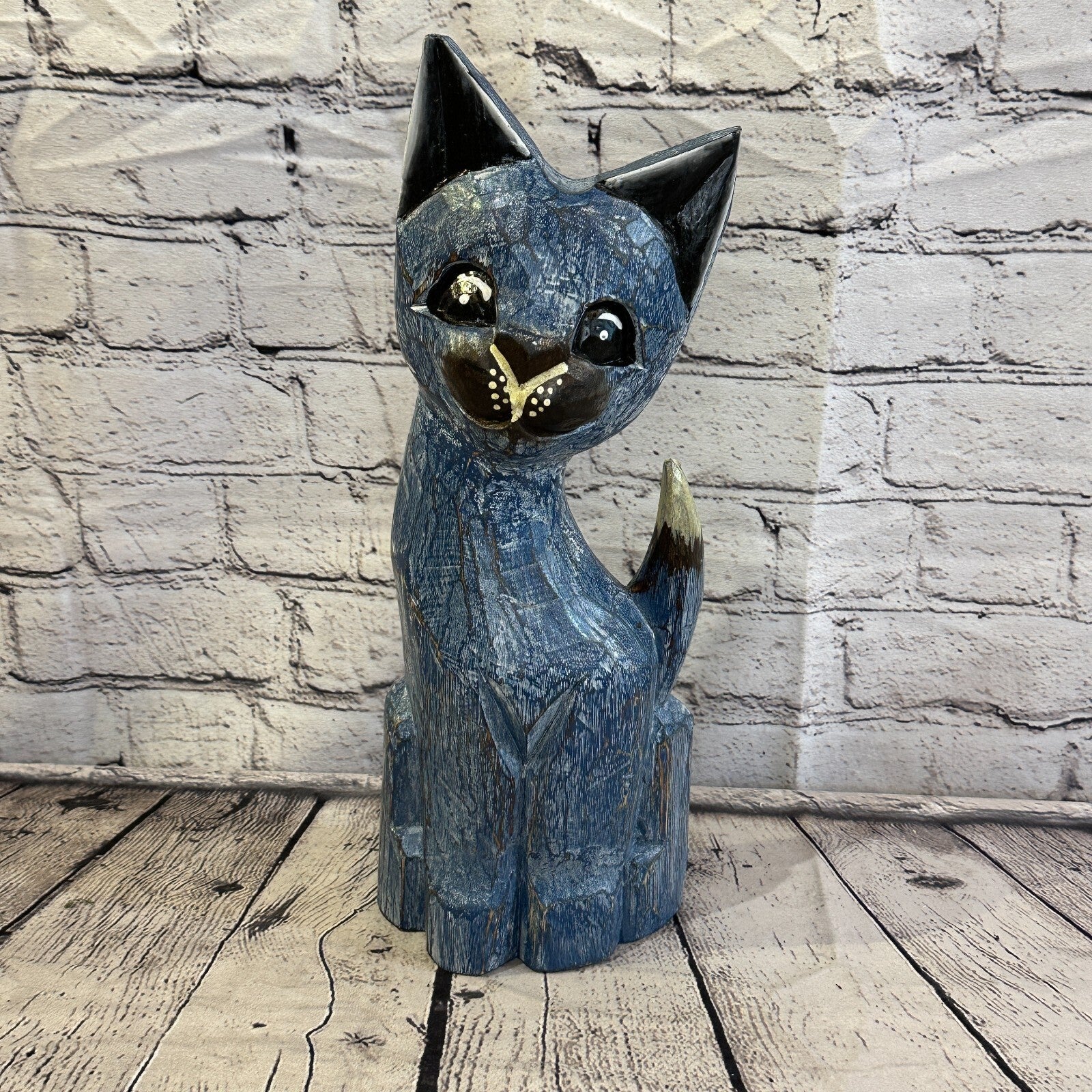 35cm x 15cm Blue Flower Wooden Shabby Cat Statue Ornament Fair Trade Handcarved
