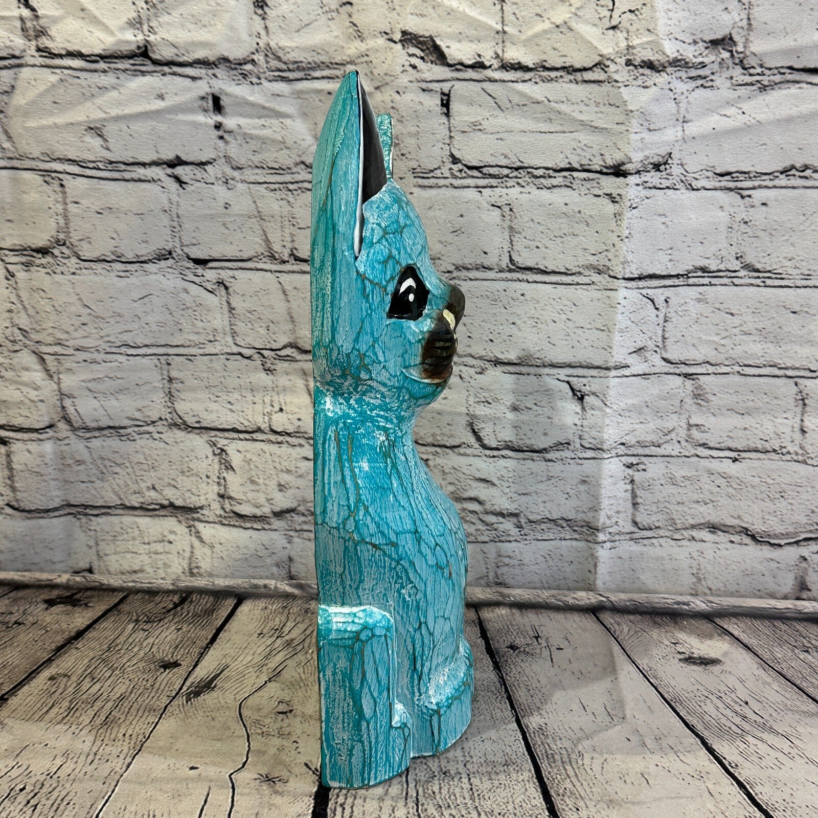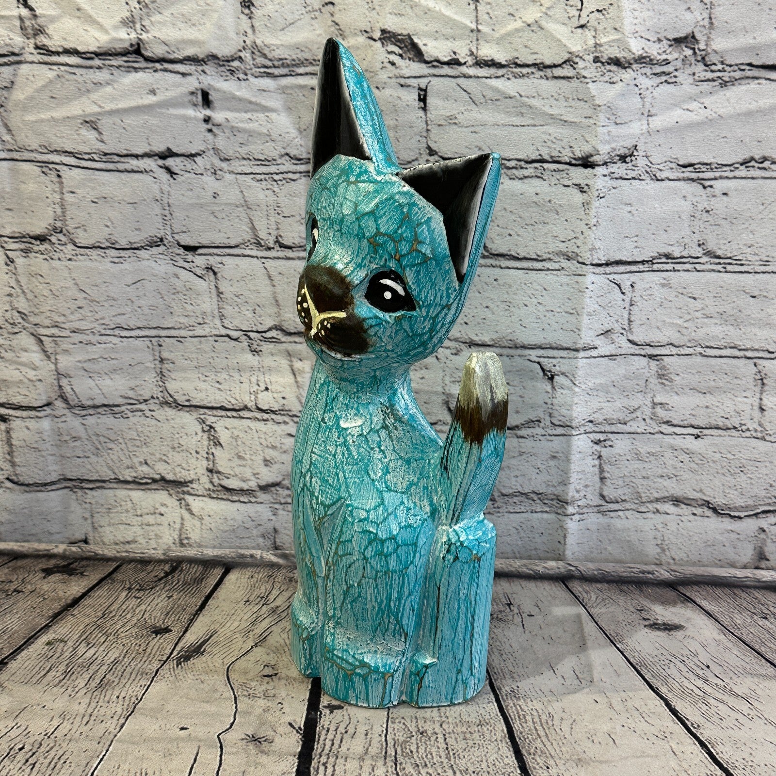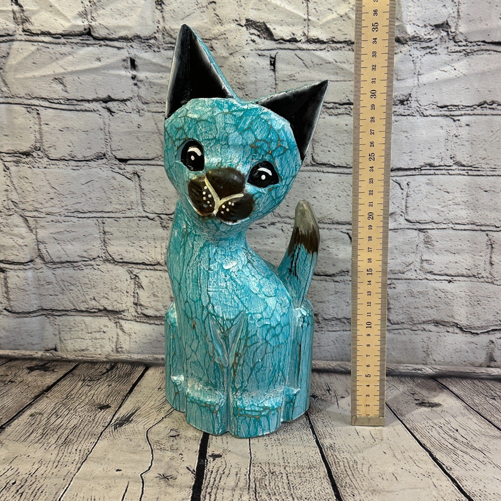 35cm x 15cm Green Flower Wooden Shabby Cat Statue Ornament Fair Trade Handcarved