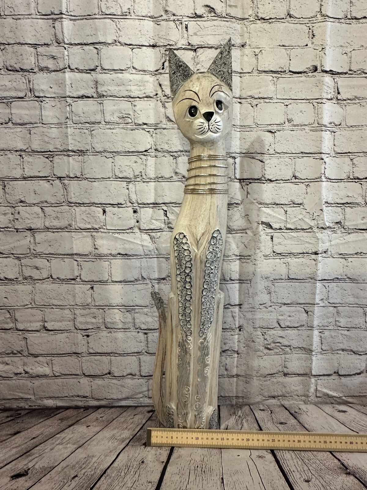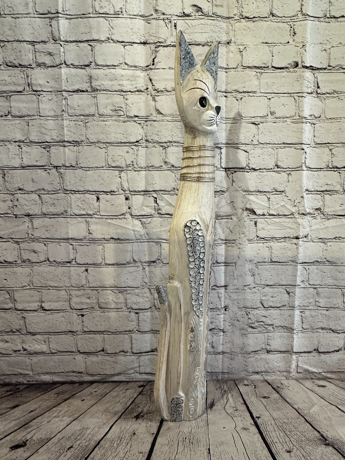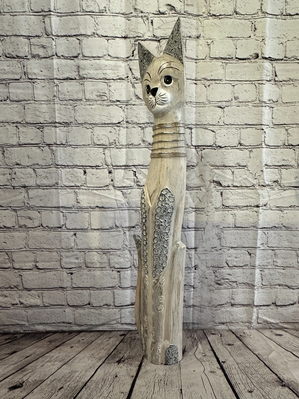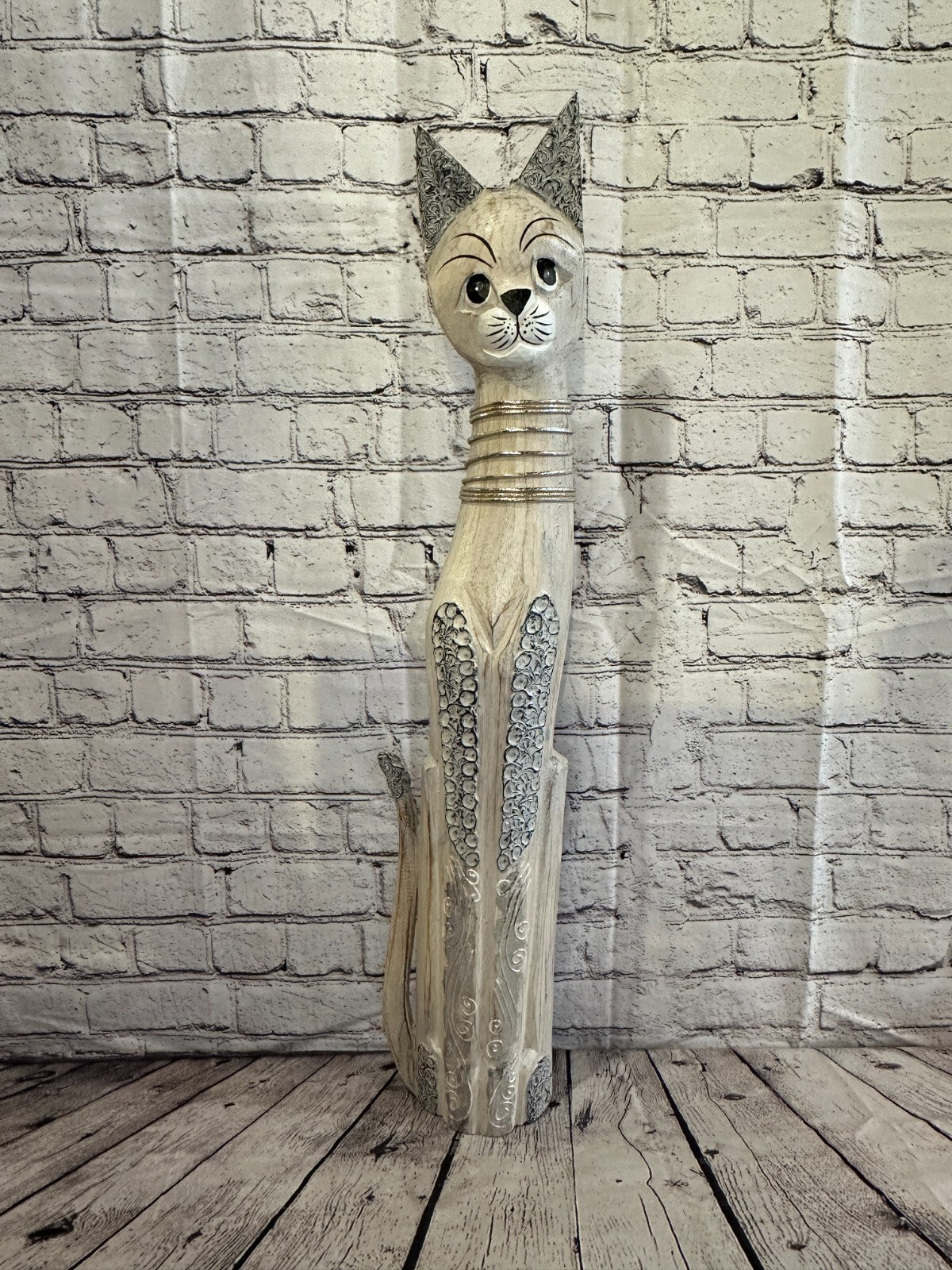 80cm White Swirl Flower Wooden Shabby Cat Statue Ornament Fair Trade Handcarved