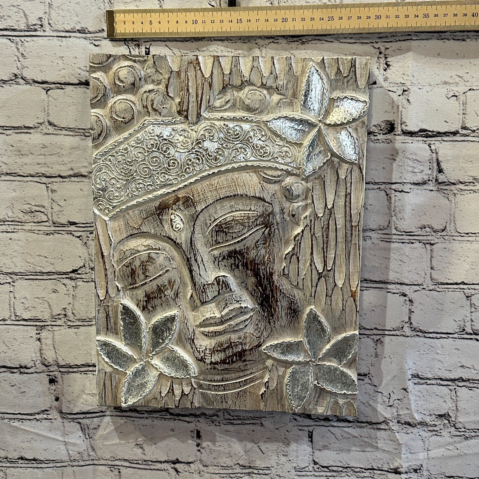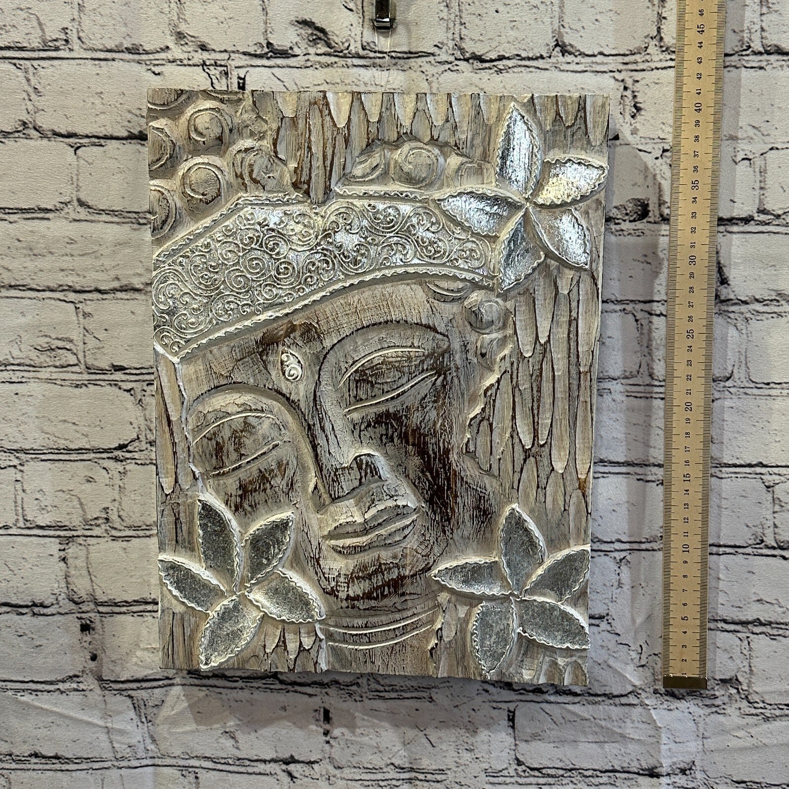 Wooden Wood Panel 40cm Brown White Buddha Hibiscus Wall Art Plaque Handcarved